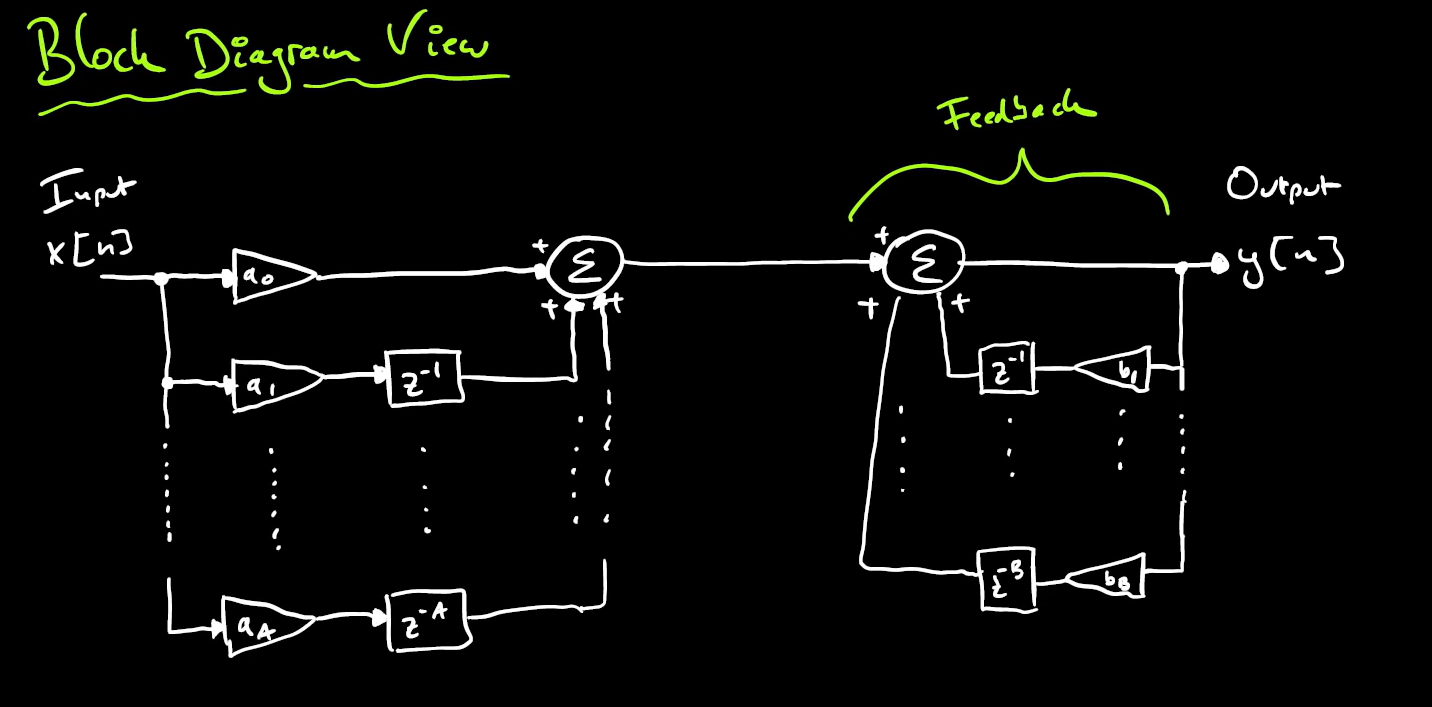 - $y[n] = \sum_{i = 0}^{A}a_i~x[n-i] + \sum_{j = 1}^{B}b_j~y[n-j]$ (discrete time)